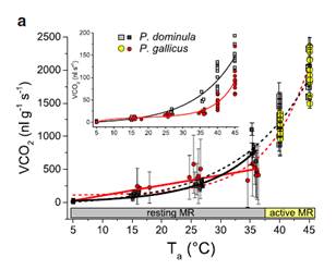 2017年Helmut Kovac等人在《J COMP PHYSIOL B》雜志上發(fā)表了:“Comparison of thermal traits of Polistes dominula and Polistes gallicus, two European paper wasps with strongly differing distribution ranges”一文,該文應(yīng)用了SSI的昆蟲呼吸代謝測量系統(tǒng)以及紅外熱成像系統(tǒng),對兩種歐洲黃蜂的體溫和新陳代謝進行了研究,證明了在不同溫度環(huán)境條件下,兩種黃蜂對環(huán)境的耐受性不同,其體溫調(diào)節(jié)方式?jīng)Q定了對不同地域的適應(yīng)性。