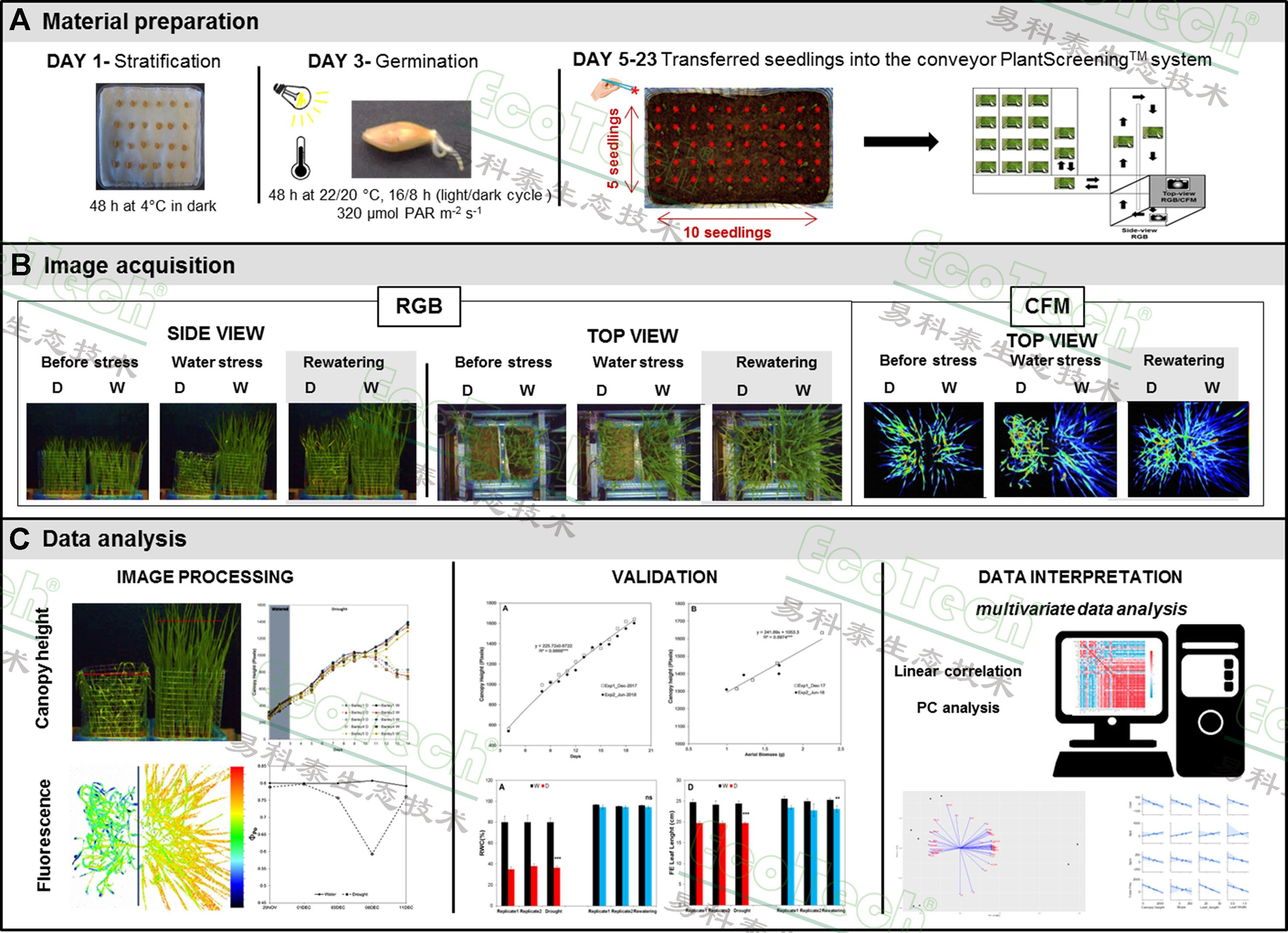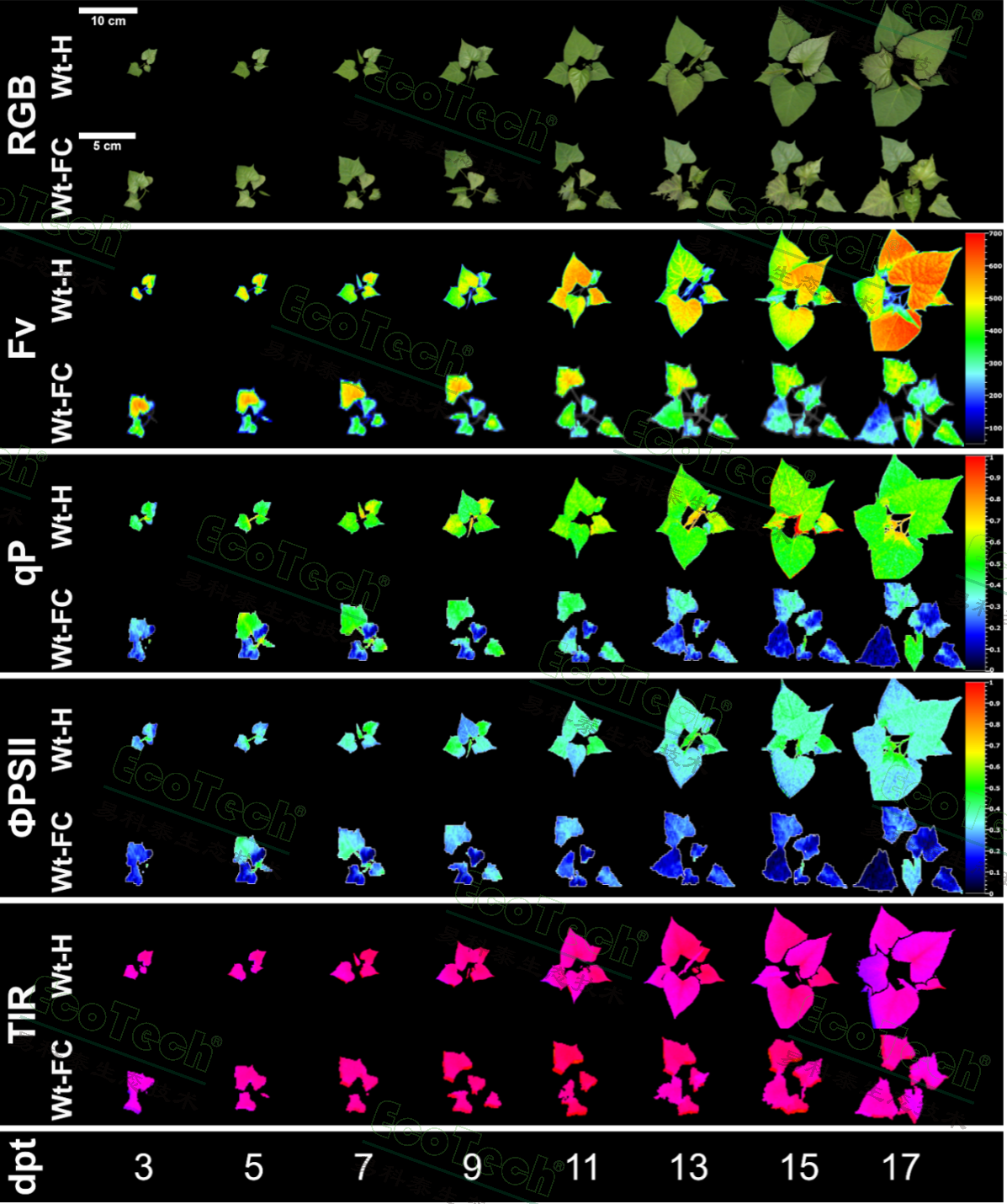 ·可與RGB成像形態(tài)結(jié)構(gòu)參數(shù)及FluorCam光合效率參數(shù)進(jìn)行相關(guān)分析等;可完整記錄追溯干旱過(guò)程與復(fù)水過(guò)程的動(dòng)態(tài)響應(yīng)等