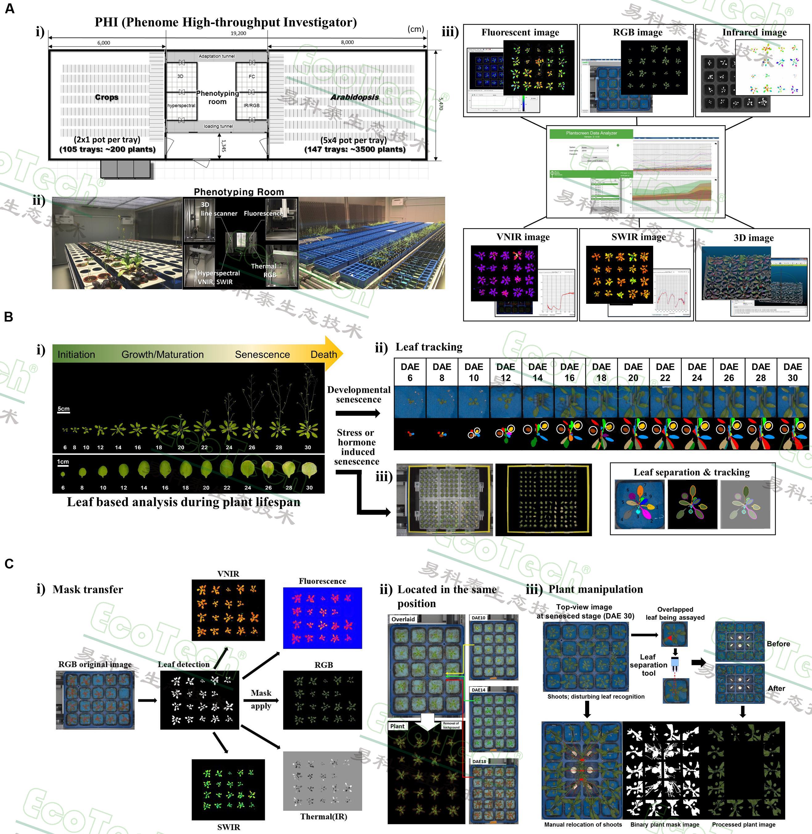 PlantScreen高通量植物表型成像分析平臺(tái)由國(guó)際知名公司PSI公司研制生產(chǎn),整合了LED植物智能培養(yǎng)、自動(dòng)化控制系統(tǒng)、葉綠素?zé)晒獬上駵y(cè)量分析(可擴(kuò)展多光譜熒光成像)、植物熱成像分析、植物近紅外成像分析、RGB真彩3D成像、高光譜成像、3D激光掃描成像分析、RhizoTron根系成像分析、自動(dòng)條碼識(shí)別管理、自動(dòng)稱(chēng)重與澆灌系統(tǒng)等多項(xiàng)先進(jìn)技術(shù),以最優(yōu)化的方式實(shí)現(xiàn)大量植物樣品的全方位生理功能與形態(tài)結(jié)構(gòu)自動(dòng)成像分析,用于玉米、水稻、小麥、大豆及椰樹(shù)等熱帶作物高通量表型成像分析測(cè)量、脅迫響應(yīng)成像分析測(cè)量、生長(zhǎng)分析測(cè)量、生態(tài)毒理學(xué)研究、性狀識(shí)別、抗性篩選、作物遺傳育種及植物生理生態(tài)分析研究等。