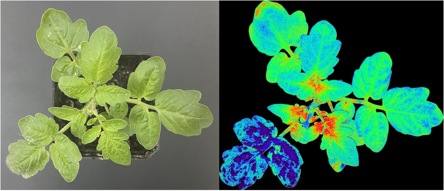 上左圖為番茄RGB成像,右圖為葉綠素熒光Rfd成像,番茄植株左下角復(fù)葉施加光合作用阻斷劑DCMU