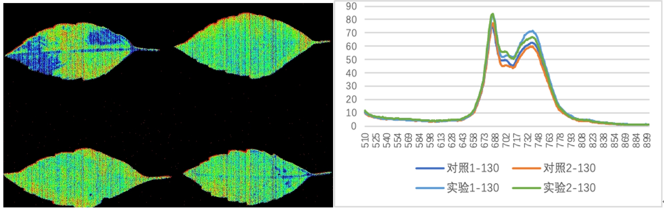 敵草隆處理烏蘞莓實(shí)驗(yàn):左圖左上角和右下角為實(shí)驗(yàn)組(葉柄浸藥)、右上角和左下角為對(duì)照組,可以看出實(shí)驗(yàn)組的葉柄和葉脈最大光量子產(chǎn)量QY_max明顯降低(藍(lán)色);右圖為其葉綠素?zé)晒夤庾V,實(shí)驗(yàn)組葉綠素?zé)晒饷黠@高于對(duì)照組(易科泰SpectrAPP光譜成像實(shí)驗(yàn)室提供)