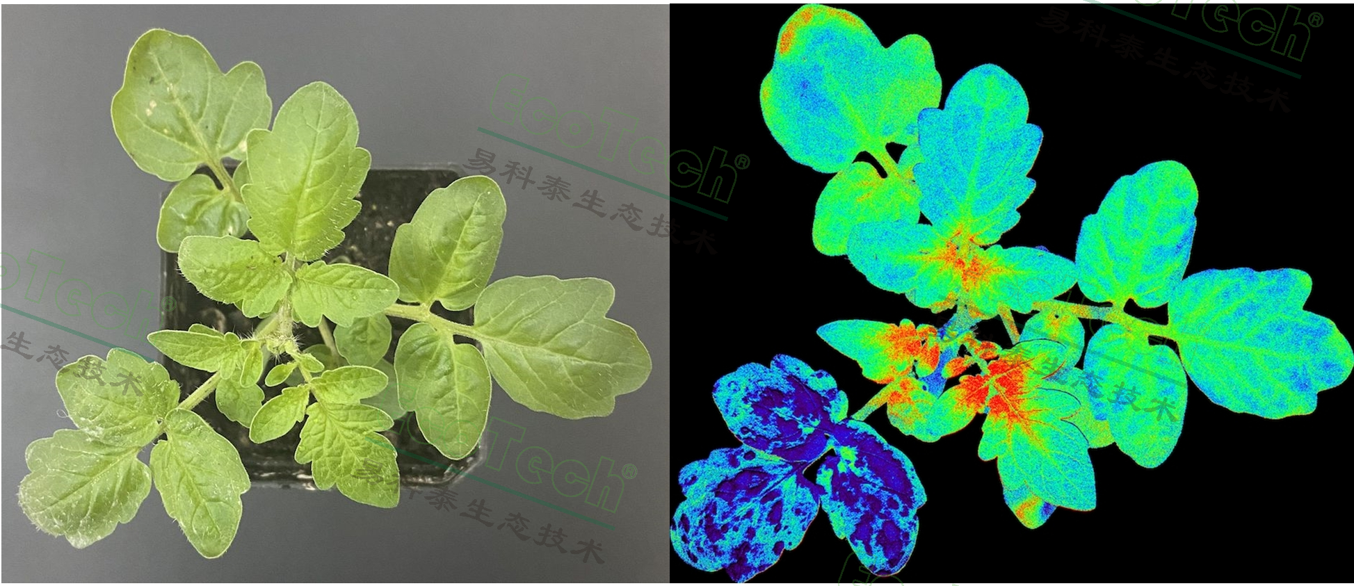 上左圖為番茄RGB成像,右圖為葉綠素?zé)晒釸fd成像,番茄植株左下角復(fù)葉施加光合作用阻斷劑DCMU