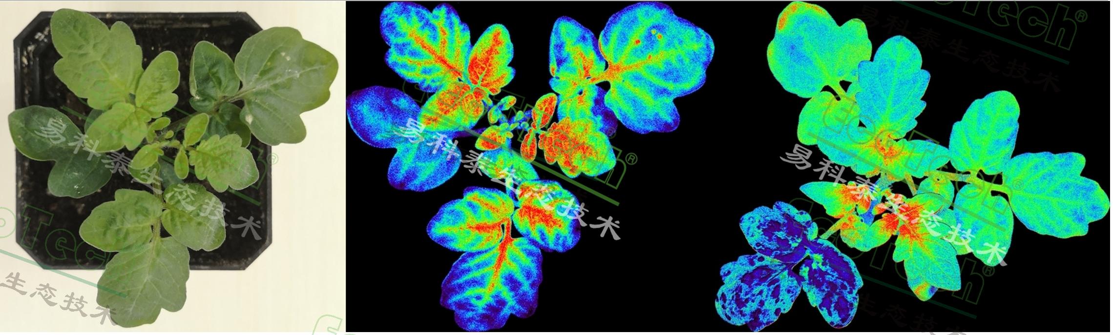 上圖自左至右依次為:番茄苗彩色成像、健康番茄苗葉綠素?zé)晒獬上瘛CMU處理(左下角葉片)后的番茄苗葉綠素?zé)晒馑p指數(shù)(Rfd)成像