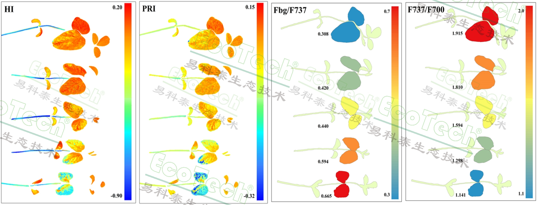 自左至右依次為:健康指數(shù)、PRI指數(shù)、藍(lán)綠熒光與葉綠素?zé)晒獗戎抵笖?shù)、F737/F700(反映葉綠素含量)??梢钥闯?,隨著自上至下施藥濃度的梯度增大,水培大豆苗受脅迫程度逐漸加重