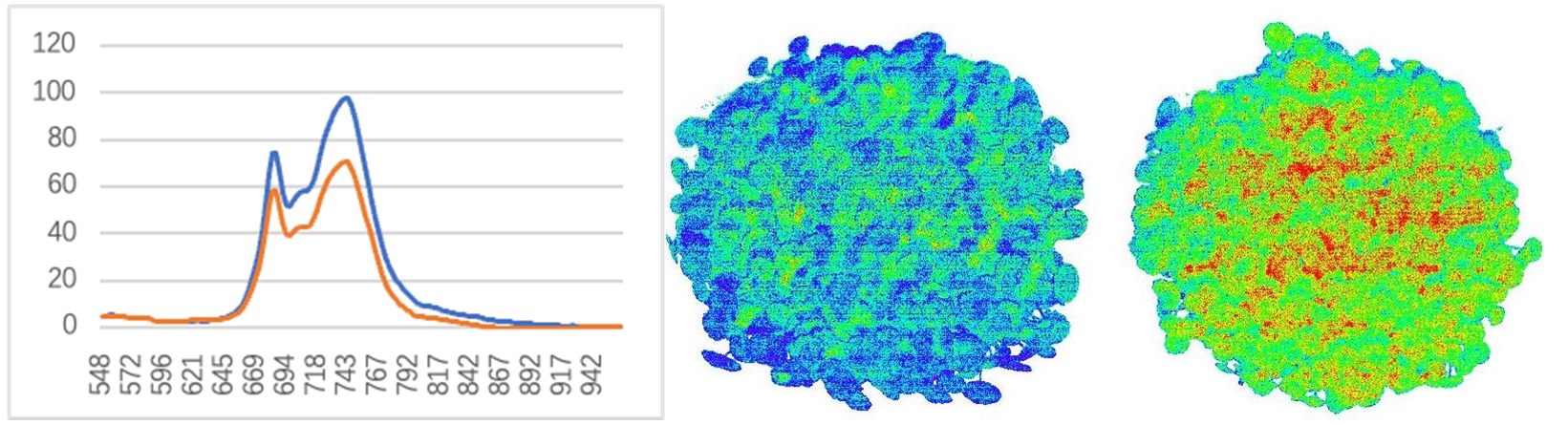 左圖:銅錢草葉綠素?zé)晒夤庾V,其中藍(lán)色曲線為施加敵草?。―CMU)、紅色未施加敵草?。挥覉D:銅錢草太陽光誘導(dǎo)葉綠素?zé)晒獬上?,其中左邊為未施加敵草隆,右邊施加敵草隆,施加敵草隆后由于PSII QA電子傳遞被抑制(光化熒光淬滅阻斷),葉綠素?zé)晒庠鰪姡ㄉ鲜鰯?shù)據(jù)均來自易科泰光譜成像與無人機遙感技術(shù)研究中心)