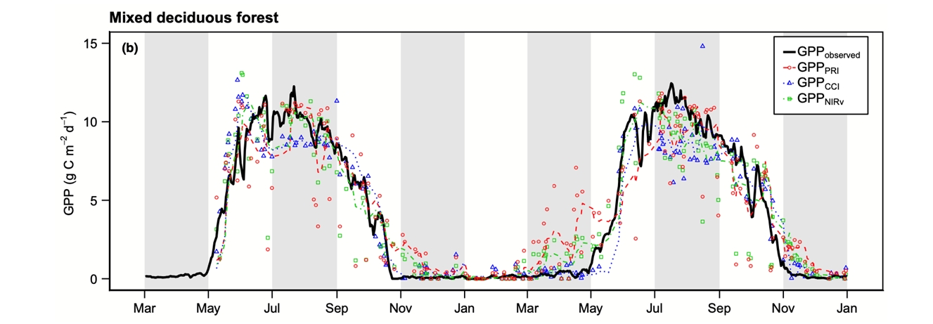 基于PRI、CCI和NIRv模型可以很好地擬合通量塔觀測的季節(jié)性GPP變化(Wong等,2020)