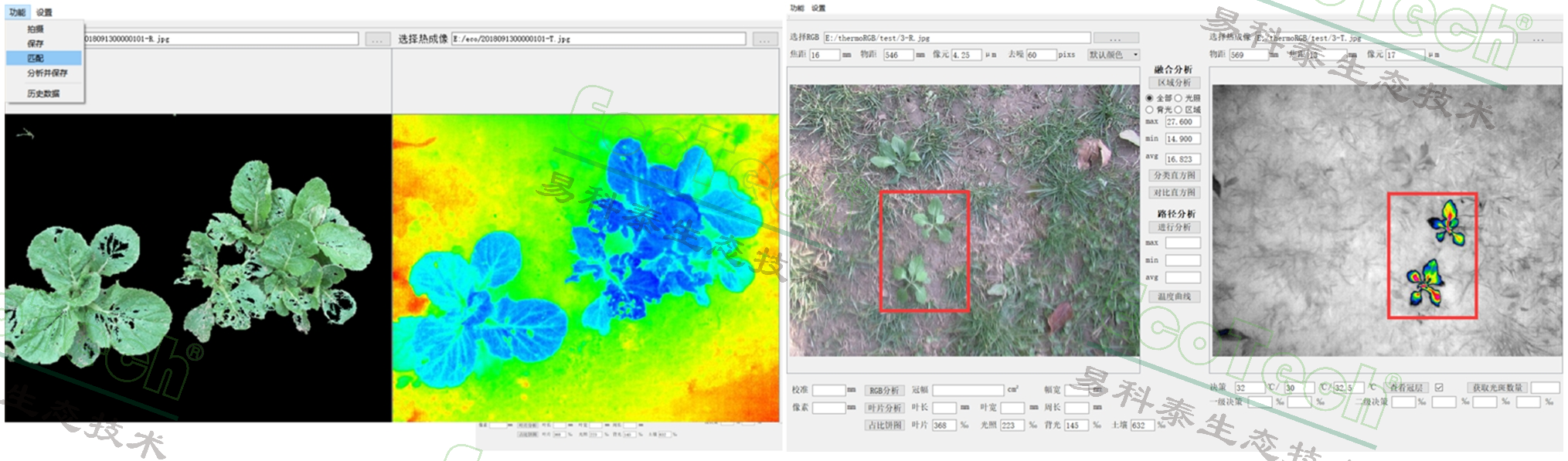 - Thermo-RGB成像融合分析:可進行手動/自動ROI分析;光照/背光葉片長度、寬度、周長、凸包面積、圓度等形態(tài)分析;最高、最低、平均溫度、最大溫差、中位數(shù)等溫度分析;R/G/B、H/S/V等顏色分析,具備溫度直方圖統(tǒng)計、路徑分析、溫度轉(zhuǎn)換、圖/表導(dǎo)出等功能