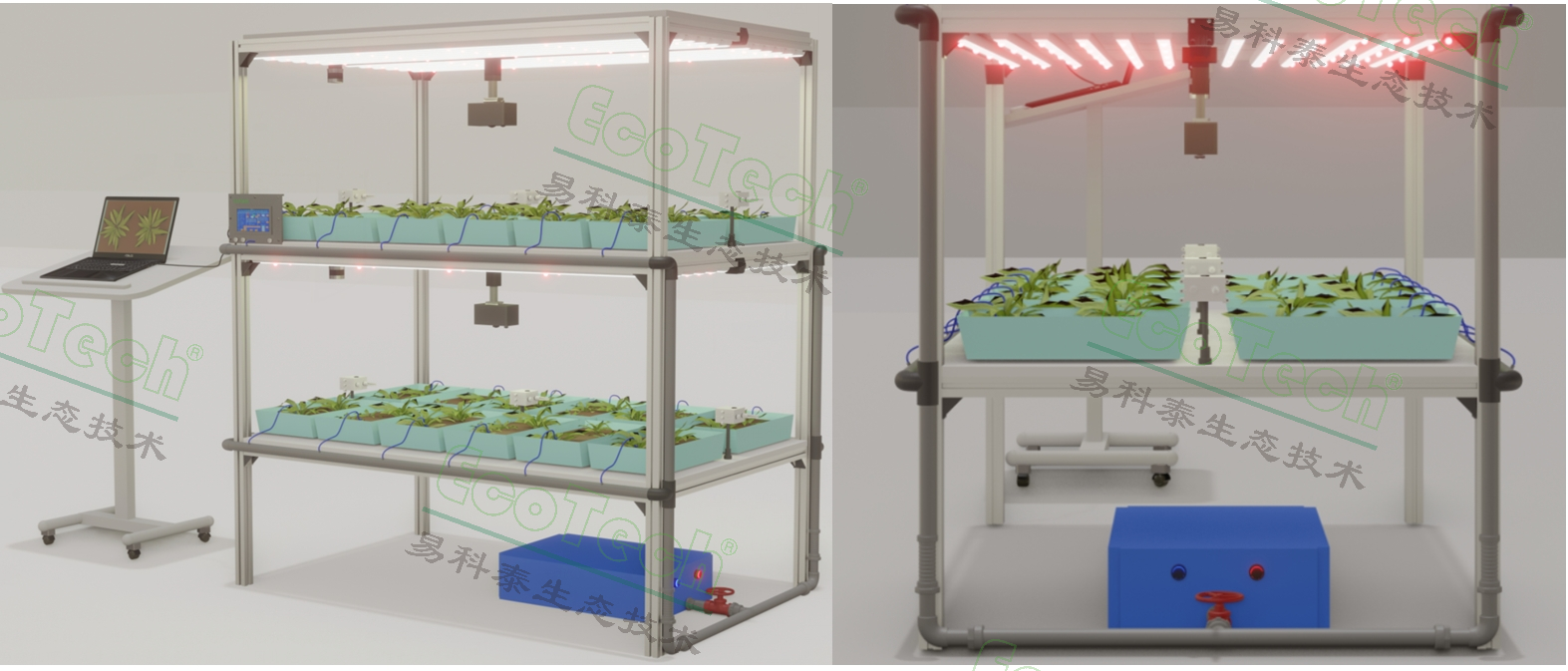 數(shù)字化植物工廠實(shí)驗(yàn)監(jiān)測系統(tǒng),是易科泰最新推出的自主研發(fā)專利技術(shù)產(chǎn)品(ZL 2024 2 1728504.0),專門針對植物工廠、智慧農(nóng)業(yè)技術(shù)領(lǐng)域?qū)嶒?yàn)監(jiān)測應(yīng)用。系統(tǒng)集多通道智能LED光源培養(yǎng)、多傳感器表型性狀在線監(jiān)測功能于一體,同時可配套數(shù)字化培養(yǎng)設(shè)施、自動澆灌施肥、環(huán)境監(jiān)測及遠(yuǎn)程控制功能。應(yīng)用于數(shù)字化、智能化植物培養(yǎng)及表型性狀在線監(jiān)測,通過提供不同光譜組合、光強(qiáng)以實(shí)驗(yàn)?zāi)M不同光配方對植物的生長和生理生化的影響,研究最佳光配方等。通過RGB成像、葉綠素?zé)晒獬上?、高光譜成像等先進(jìn)技術(shù),高通量、非損傷、非接觸、數(shù)字化、可視化檢測植物生長、生理狀態(tài)、生化指標(biāo)如光合效率、健康指標(biāo)、衰老成熟指標(biāo)、脅迫、色素含量指標(biāo)、黃酮醇含量指標(biāo)、次級代謝產(chǎn)物等,用來全方位實(shí)驗(yàn)?zāi)M植物從育種培養(yǎng)、生長監(jiān)測、環(huán)境控制及干預(yù)、長勢及品質(zhì)評價等全生命周期過程。