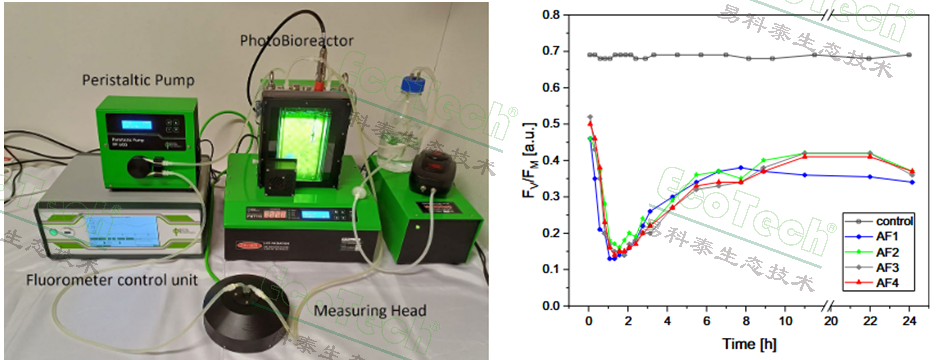 左圖為系統(tǒng)配置,包括平板式光養(yǎng)生物反應(yīng)器與雙調(diào)制葉綠素?zé)晒鉁y(cè)量單元;右圖為四個(gè)處理組(AF1、AF2、AF3、AF4)和對(duì)照組24小時(shí)內(nèi)Fv/Fm(反映PSII光合效率)變化