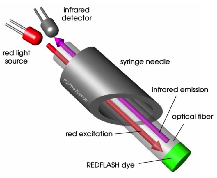 REDFLASH光極O2傳感器技術(shù),利用獨特的O2敏感REDFLASH指示劑,通過610-630nm調(diào)制紅光激發(fā),REDFLASH指示劑發(fā)出760-790nm紅外熒光,熒光強度隨接觸的O2分子濃度升高而發(fā)生熒光淬滅,這種熒光動態(tài)通過光纖傳輸?shù)綔y量儀,測量儀靈敏地檢測其相位漂移并據(jù)此換算成O2濃度。