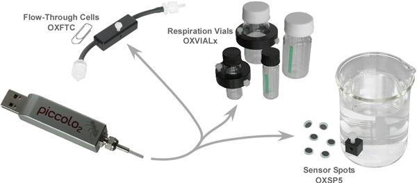 ● 有內(nèi)置sensor spot的流通管和呼吸瓶,非接觸式測量流動液體的溶解氧及呼吸瓶內(nèi)液體或氣體中氧氣含量