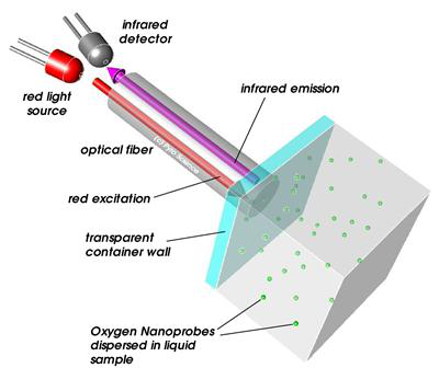 6. 納米微粒傳感器(參見上右圖):納米技術(shù),用于非接觸性測量微量液體中O2含量,即時響應(yīng),測量范圍0-50%(0-23mg/l),檢測極限0.02%(0.01mg/l),分辨率0.05%(0.025mg/l)@20% O2,存儲時間大于3年(室溫暗處儲放)