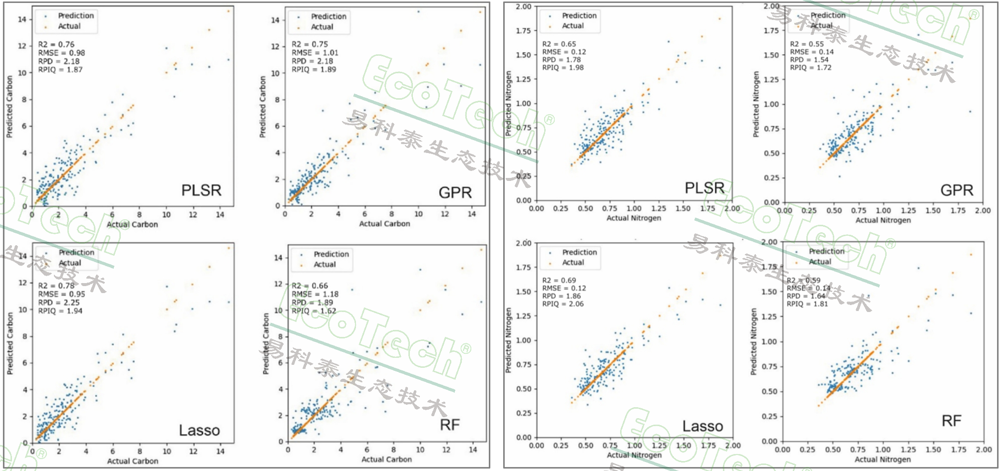 圖3:使用多種回歸算法(PLSR、GPR、LR和RF)對土壤樣本中SOC(左)和氮含量(右)的回歸分析