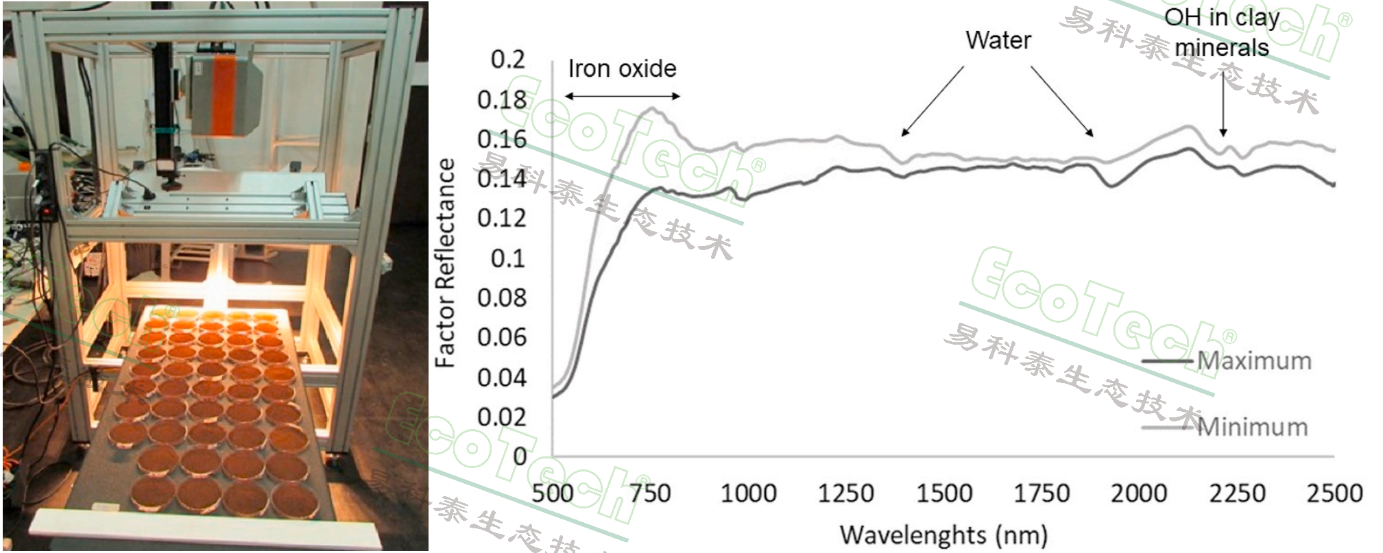 圖4:高光譜成像掃描平臺(左)及具不同SOM含量的土壤樣品反射光譜曲線