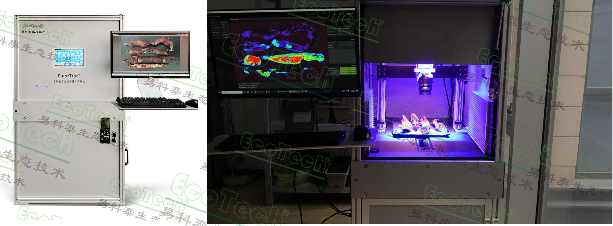 左:FluorTron®多功能高光譜成像系統(tǒng);右:風(fēng)干牛肉UV-MCF生物熒光高光譜成像檢測(cè)