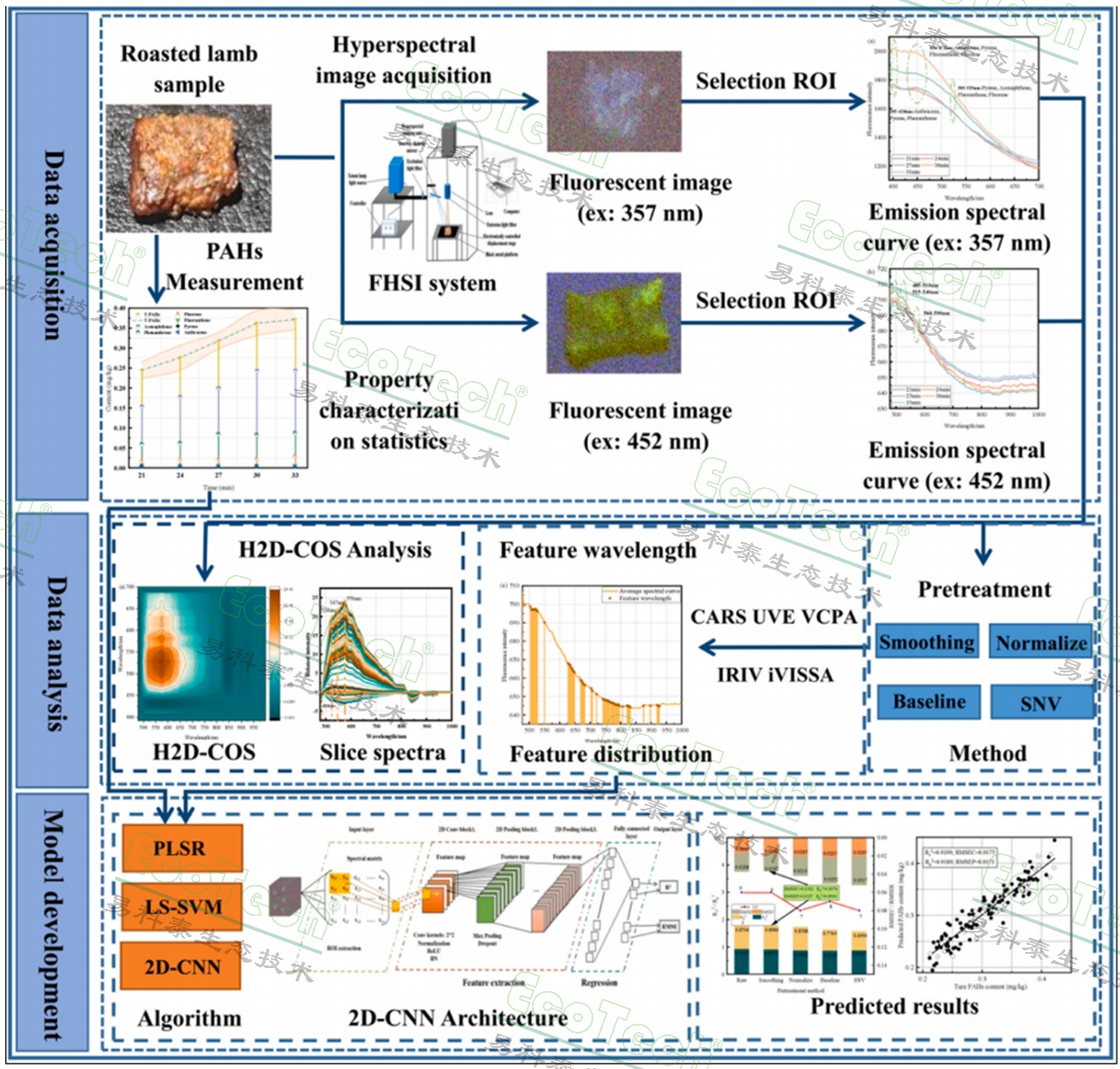 利用生物熒光高光譜成像技術(shù)定量測(cè)定烤灘羊肉中 T-PAHs(引自Jie Hao etc. 2023. Quantification of polycyclic aromatic hydrocarbons in roasted Tan lamb using fluorescence hyperspectral imaging technology. Journal of Food Composition and Analysis)
