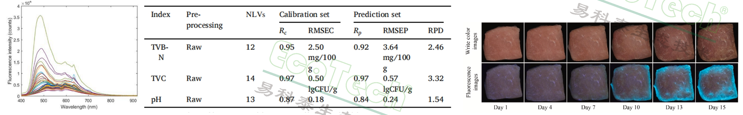左圖:豬肉樣品熒光光譜;中圖:PLSR方法根據(jù)原始光譜為60個(gè)樣品的TVB-N、TVC和pH值預(yù)測(cè)建立定量模型的結(jié)果;右圖:15天內(nèi)豬肉顏色和熒光圖像的變化(引自:Qibin Zhuang etc. 2022. UV-fluorescence imaing for real-time non-destructive monitoring of pork freshness. Food Chemistry)