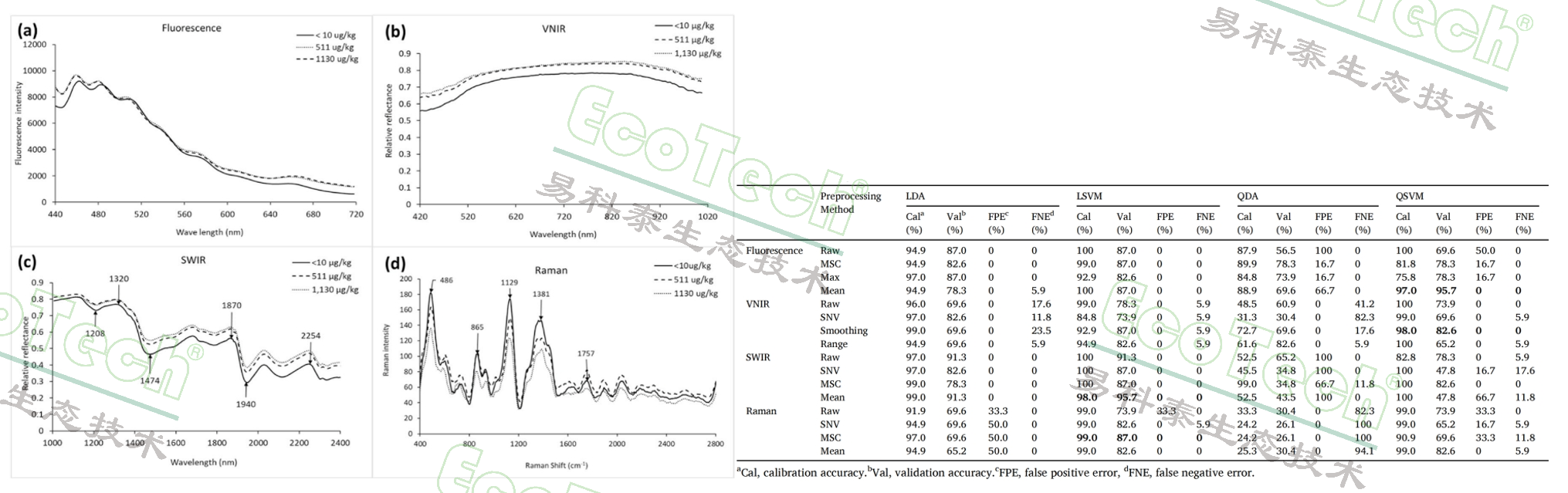 表1:四種高光譜成像系統(tǒng)結(jié)合不同預(yù)處理方法對(duì)黃曲霉毒素污染樣本進(jìn)行分析時(shí),線(xiàn)性判別分析(LDA)、線(xiàn)性支持向量機(jī)(LSVM)、二次判別分析(QDA)和二次支持向量機(jī)(QSVM)模型的驗(yàn)證結(jié)果。