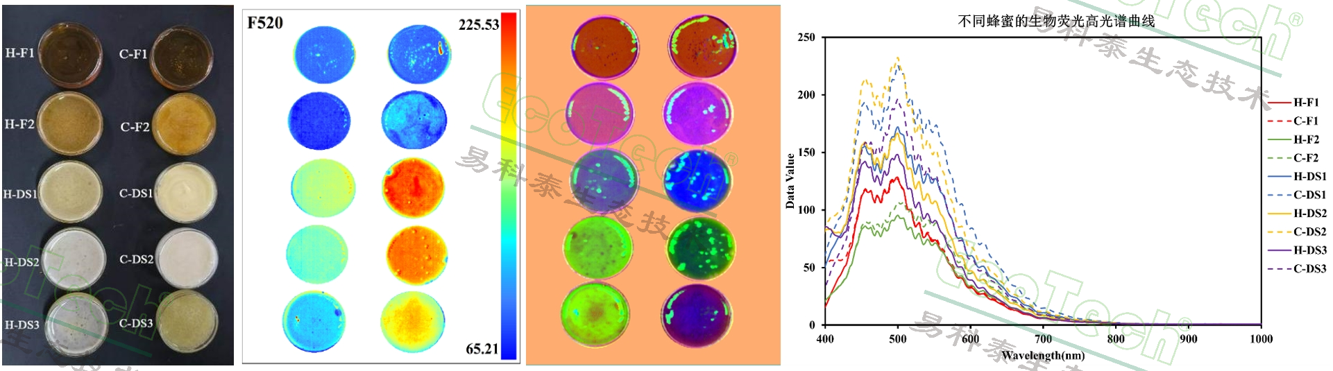 圖3:使用FluorTron®多功能高光譜成像系統(tǒng)對(duì)不同蜂蜜樣品進(jìn)行紫外光激發(fā)的生物熒光數(shù)據(jù)分析,從左到右:蜂蜜樣品RGB圖像、F520熒光成像圖、不同品質(zhì)蜂蜜分類(lèi)圖及其在紫外燈下400-1000nm的熒光光譜