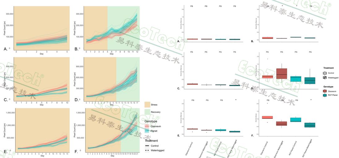 圖3(左) 實驗1中Glasnevin no.5與RGT Planet兩品種在水淹與對照條件下的地上部投影面積PSA(n = 5)。橙色區(qū)段為脅迫持續(xù)期,綠色區(qū)段為恢復(fù)期;PSA為側(cè)視與俯視分割像素之和。A–F分別對應(yīng)處理P1–P6。