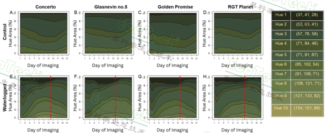 (A–D)對照條件下4種基因型大麥的表現(xiàn);(E–H)相應(yīng)基因型在脅迫條件下的表現(xiàn)。紅色豎線標(biāo)示脅迫結(jié)束與恢復(fù)期開始。圖中給出各色調(diào)的RGB值與十六進制色碼。