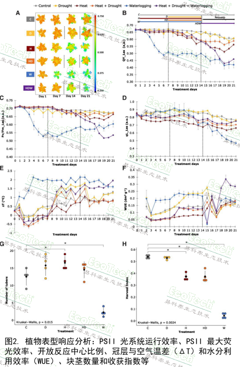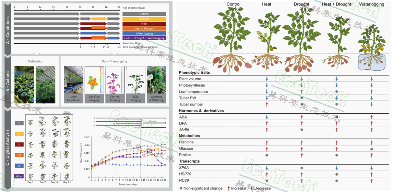 在這項(xiàng)覆蓋5種脅迫處理(高溫、干旱、水澇、高溫+干旱、高溫+干旱+水澇)的研究中,PlantScreen平臺(tái)承擔(dān)了“全天候表型監(jiān)測(cè)官”的角色。研究團(tuán)隊(duì)選取中度抗逆的馬鈴薯Desirée品種,通過(guò)平臺(tái)集成的RGB成像、葉綠素?zé)晒獬上?、熱成像等多傳感器模塊,實(shí)現(xiàn)了每日無(wú)侵入式數(shù)據(jù)采集。