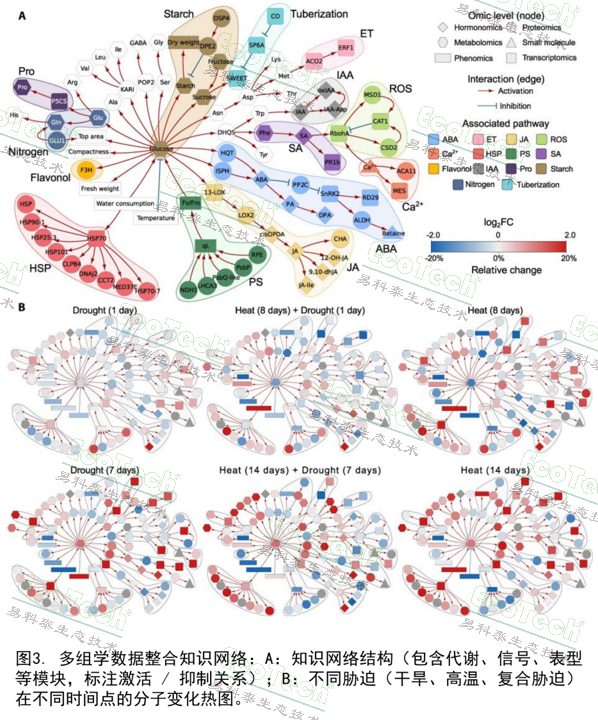 研究發(fā)現(xiàn),水澇脅迫下PlantScreen監(jiān)測(cè)到的氣孔快速關(guān)閉,與激素組中ABA及其降解產(chǎn)物PA、DPA的顯著積累高度同步,證實(shí)了水澇脅迫會(huì)激活類似干旱的ABA信號(hào)通路——這一發(fā)現(xiàn)依賴于表型數(shù)據(jù)捕捉到的“瞬時(shí)響應(yīng)”與激素組學(xué)的“時(shí)序變化”的聯(lián)動(dòng)分析。而高溫+干旱復(fù)合脅迫下,PlantScreen記錄到的植株體積驟減變化,對(duì)應(yīng)著代謝組中組氨酸、支鏈氨基酸的大量積累,以及蛋白質(zhì)組中熱休克蛋白(HSP70、HSP90)的富集,揭示了復(fù)合脅迫通過(guò)“代謝重構(gòu)+蛋白保護(hù)”應(yīng)對(duì)脅迫的協(xié)同機(jī)制。