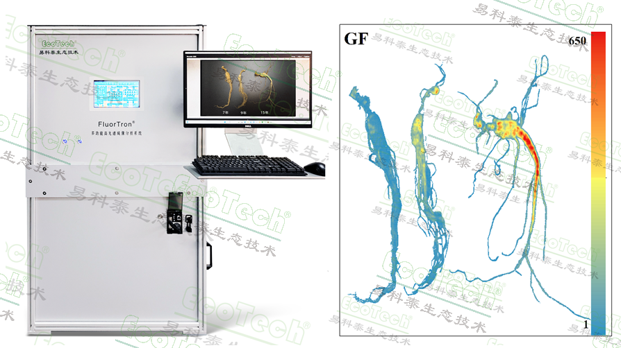 左圖為FluorTron®多功能高光譜成像系統(tǒng);右圖為人參的綠色熒光圖(左:7年;中:9年;右:15年)