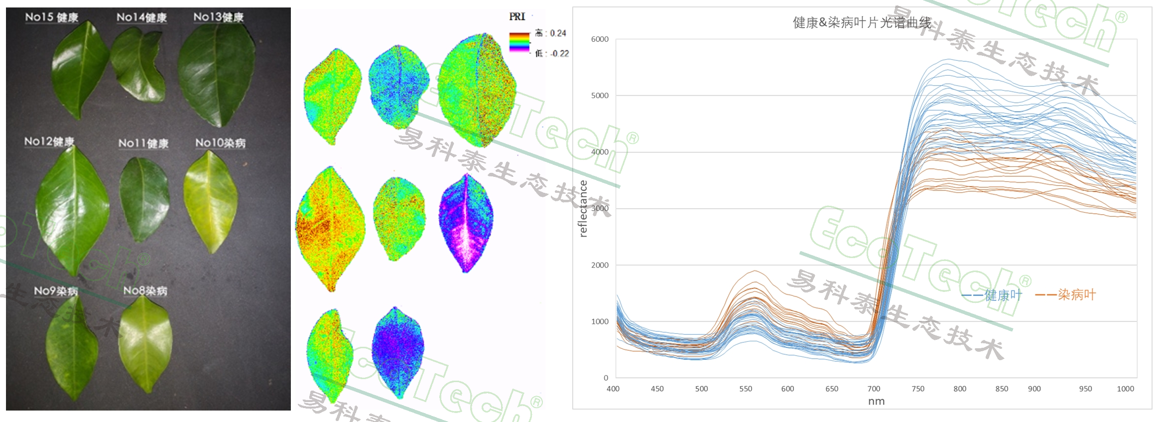 柑橘葉片黃龍病高光譜成像分析:PRI指數(shù)顯示染病葉片的光利用效率顯著降低(易科泰光譜成像實驗室提供)