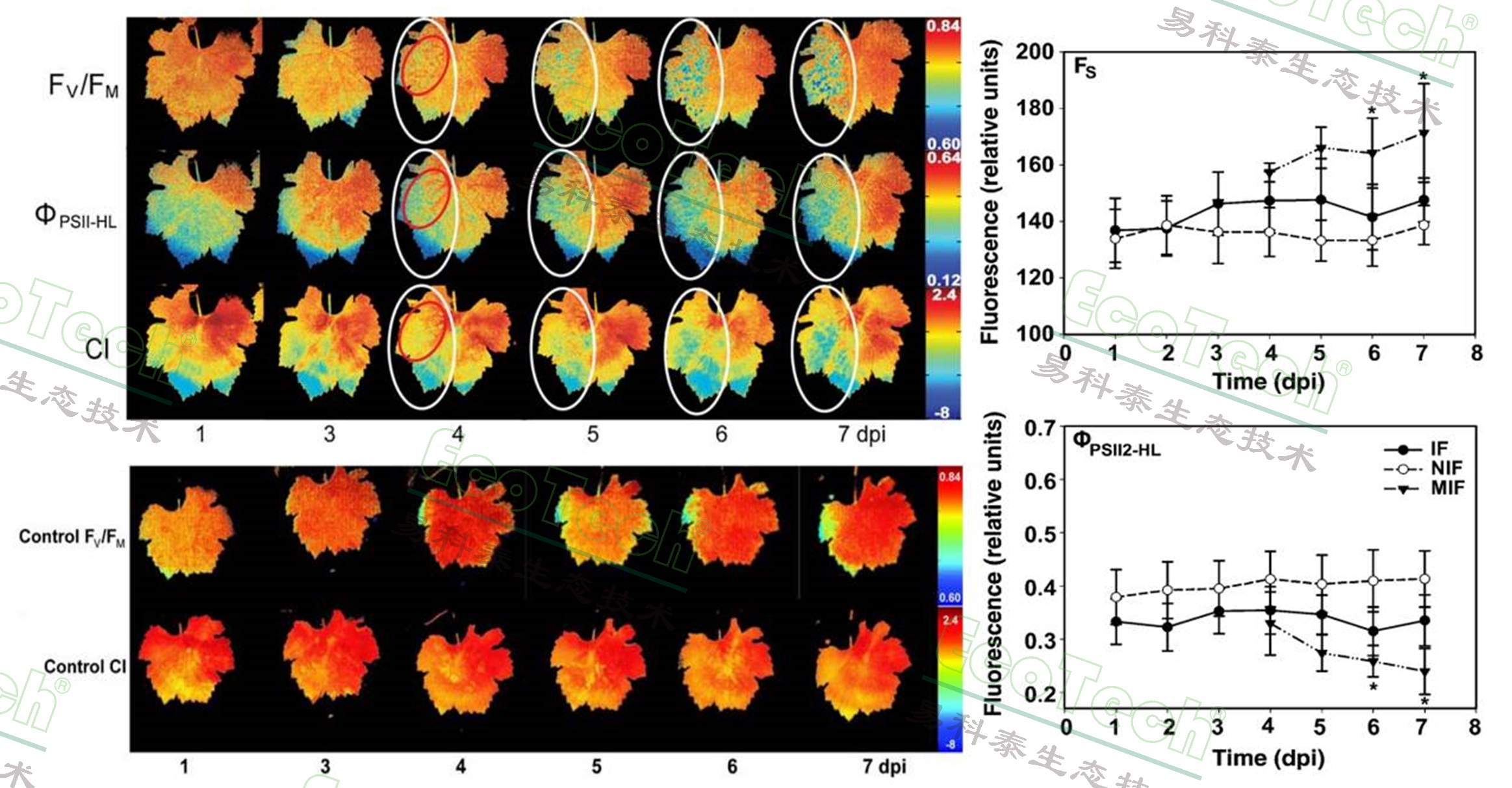 左圖:施藥組葉片(上)和對照組葉片(下)的葉綠素?zé)晒鈪?shù)隨時間的變化情況,光系統(tǒng)II的最大量子產(chǎn)率Fv/Fm、光系統(tǒng)II在高光化光下的有效量子產(chǎn)率 (ΦPSII-HL) 和葡萄藤葉片的組合成像參數(shù) (CI)。右圖:葉片部位的穩(wěn)態(tài)熒光Fs及ΦPSII-HL隨時間變化情況(IF表示被感染的半片葉子、NIF表示未被感染的半片葉子、MIF表示直接被感染的葉斑部分)(參考文獻Cséfalvay L, et al. Pre-symptomatic detection of Plasmopara viticola infection in grapevine leaves using chlorophyll fluorescence imaging[J].)