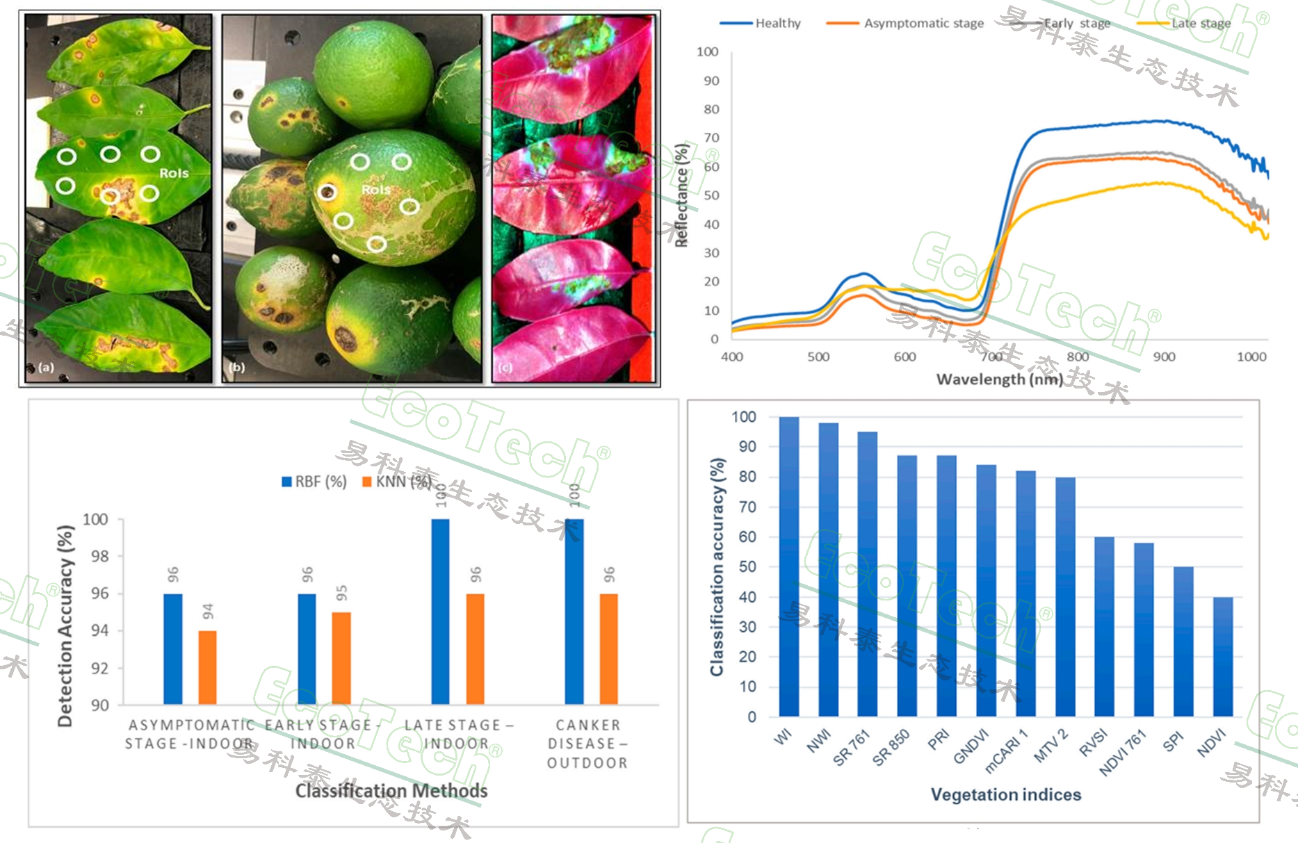 佛羅里達大學(xué)的研究人員使用高光譜成像技術(shù)檢測柑橘葉片和未成熟果實上幾個疾病發(fā)展階段(無癥狀、早期和晚期癥狀)的柑橘潰瘍病,這種疾病的無癥狀階段是治療樹木的關(guān)鍵時期。使用徑向基函數(shù) (RBF)、K 最近鄰 (KNN)法對樣品進行識別,在RBF方法使用的植被指數(shù)中,水分指數(shù) (WI) 和光化學(xué)反射指數(shù)(PRI)分別更準確地檢測了潰瘍病的無癥狀階段和早期階段。