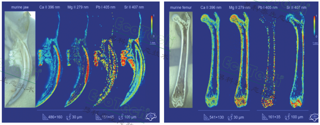 鉛(Pb)暴露不同時間的小鼠頜骨與股骨元素分布成像圖
