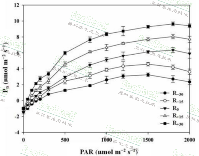 圖 2. 降雨變化下的光響應(yīng)曲線(Pn–PAR)