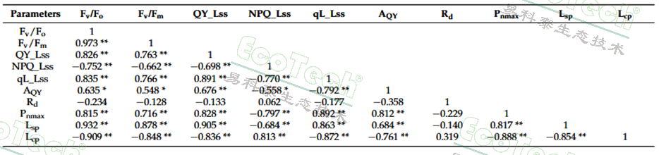 表 2. 光響應(yīng)曲線特征參數(shù)與熒光參數(shù)之間的相關(guān)性