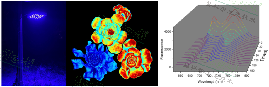 左圖 FluorTron®葉綠素?zé)晒獬上翊筇锉O(jiān)測(cè);中圖:葉綠素?zé)晒獬上?;右圖:葉綠素?zé)晒夤庾V動(dòng)態(tài)(EcoTech® 實(shí)驗(yàn)室提供)