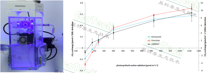 左圖,植物測量室,光照由便攜式FluorCam提供;右圖,左側(cè) y 軸為MS GAS-100 和 Omnistar 測定的整株番茄植株的光響應(yīng)曲線(藍(lán)線和紅線), 右側(cè) y 軸為Li6400XT 測定的番茄葉片樣品的光響應(yīng)曲線(黑線)