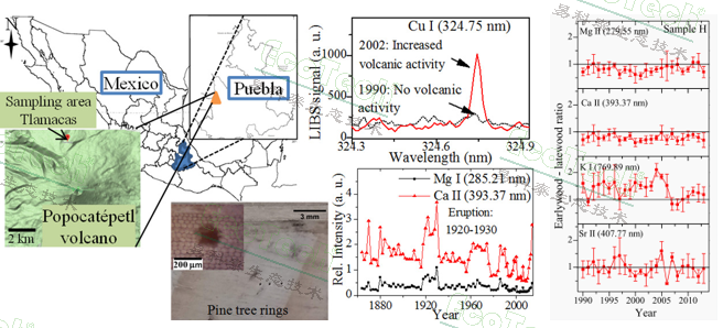 墨西哥波波卡特佩特火山具有2萬(wàn)多年的悠久噴發(fā)歷史,科研人員(Teran-Hinojosa E,2019)采集了此地區(qū)的樹芯樣品,利用LIBS技術(shù)成功識(shí)別出Al、Ca、C、Cu、Fe、Mg、Mn、K、Si、Na、Sr等11種關(guān)鍵元素,其中鈉(Na)、鎂(Mg)等輕元素的變化的與火山活動(dòng)直接相關(guān),為追溯火山噴發(fā)歷史提供了重要依據(jù)。