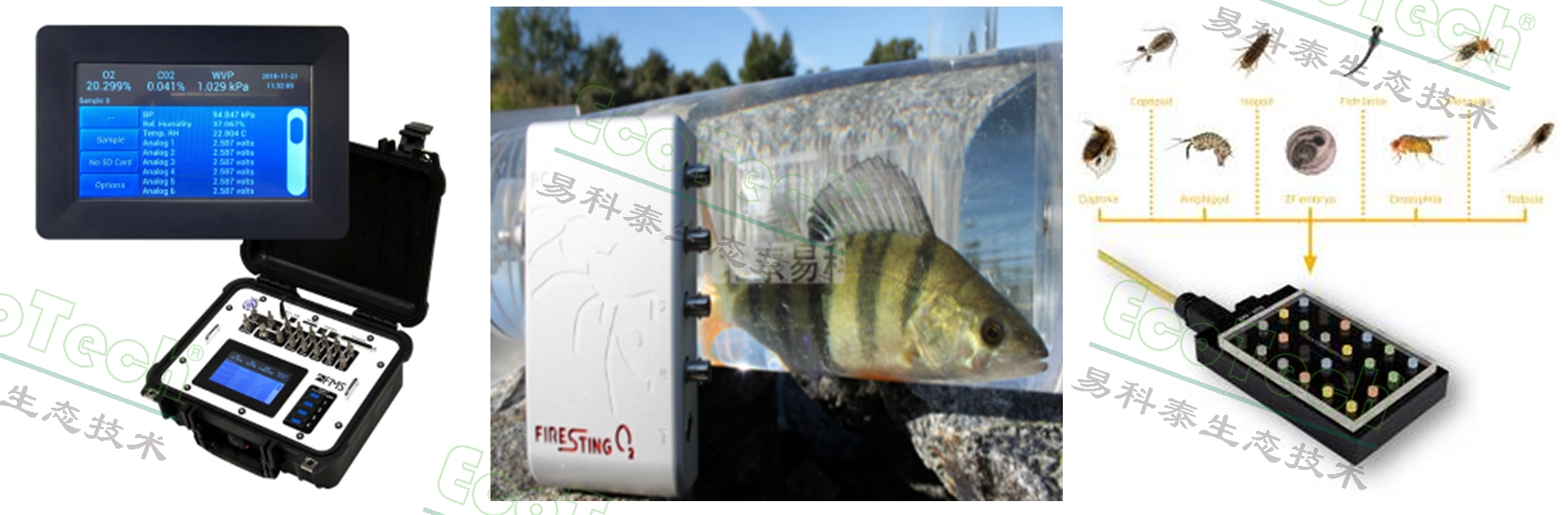 圖1左:便攜式多功能能量代謝測量儀;圖1中:魚類呼吸代謝測量系統(tǒng);圖1右:斑馬魚胚胎及幼魚高通量呼吸測量系統(tǒng)