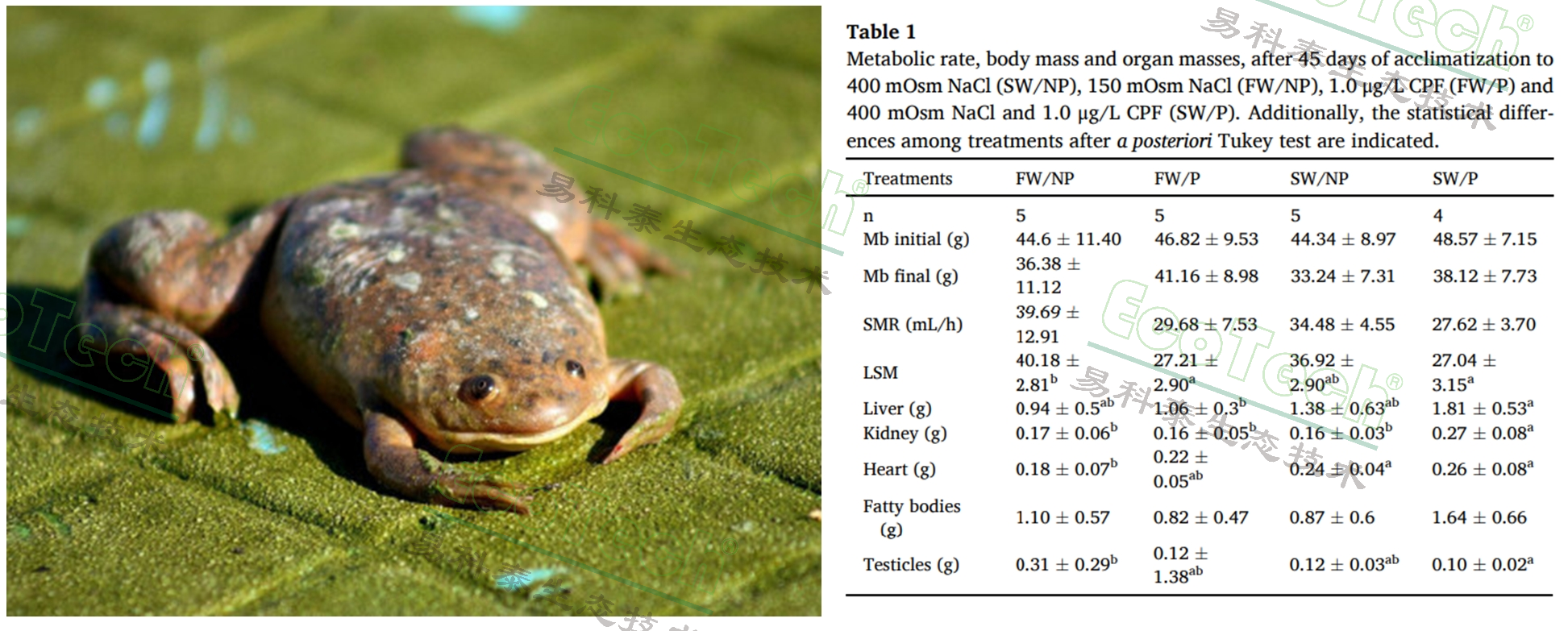 Alvarez-Vergarat團(tuán)隊利用便攜式能量代謝系統(tǒng)研究了鹽度和有機(jī)磷農(nóng)藥氯氰菊酯(CPF)對非洲爪蟾(Xenopus laevis)的生理和代謝影響。實驗設(shè)置了兩種鹽度環(huán)境(150 mOsm和400 mOsm NaCl)以及兩種農(nóng)藥濃度(0和1.0 μg/L CPF),并讓成年雄性非洲爪蟾暴露于這些環(huán)境45天。