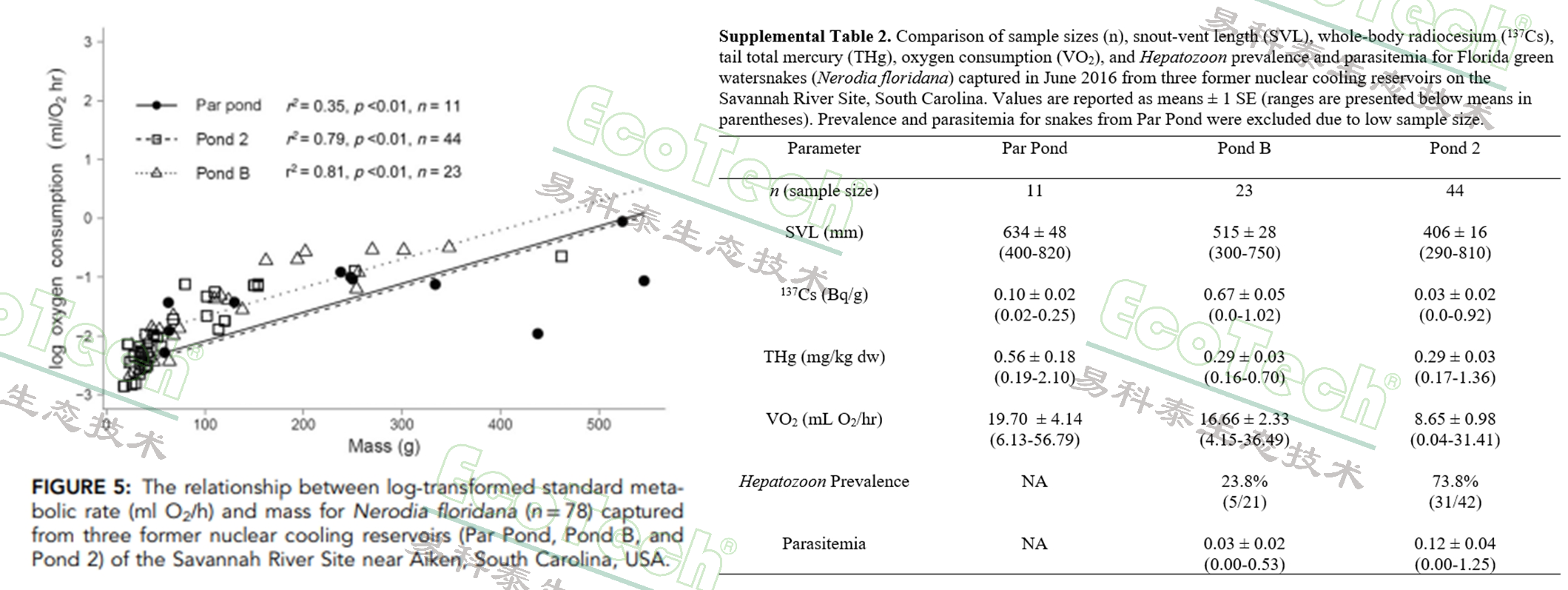 Brown等人(University of Georgia)利用便攜式能量代謝系統(tǒng)研究了汞(Hg)和放射性銫(137Cs)在佛羅里達(dá)綠水蛇(Nerodia floridana)中的生物累積及亞致死效應(yīng)。研究團(tuán)隊從美國能源部薩凡納河基地(South Carolina, USA)的三個前核冷卻水庫中捕獲了 78 條佛羅里達(dá)綠水蛇,并通過能量代謝系統(tǒng)測量了它們的標(biāo)準(zhǔn)代謝率(SMR)。