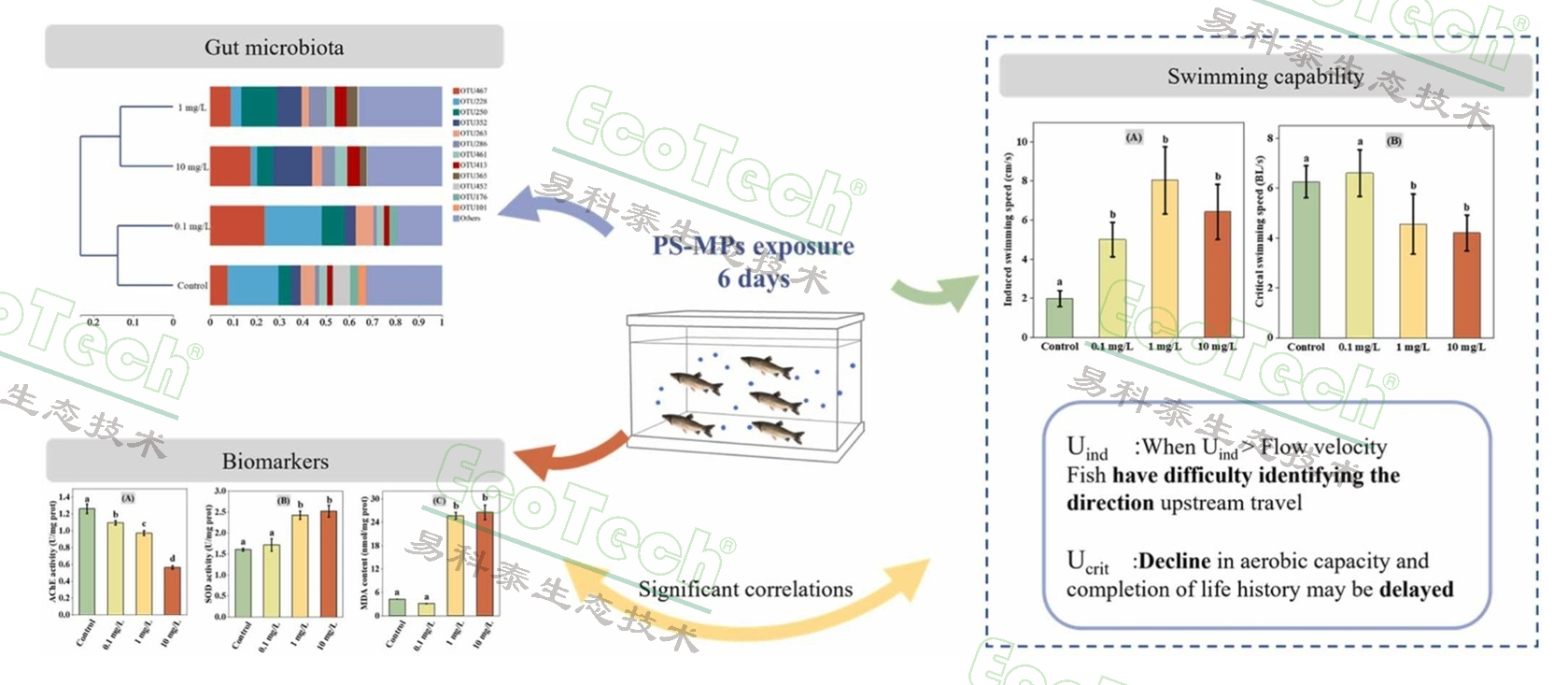 結(jié)果顯示,PS-MPs暴露顯著抑制了草魚大腦中的乙酰膽堿酯酶(AChE)活性,并在1和10 mg/L暴露濃度下顯著增加了超氧化物歧化酶(SOD)活性和丙二醛(MDA)水平,同時改變了草魚腸道微生物群落并降低了香農(nóng)多樣性指數(shù)。此外,PS-MPs顯著提高了草魚的誘導(dǎo)游泳速度,并降低了臨界游泳速度,這可能延遲草魚完成生命周期。研究還發(fā)現(xiàn)生物標(biāo)志物與游泳能力指標(biāo)之間存在顯著相關(guān)性。該研究結(jié)果表明,微塑料對魚類的生理特性產(chǎn)生了負(fù)面影響,降低了遷徙魚類的游泳能力,強(qiáng)調(diào)了微塑料污染可能對水生生態(tài)系統(tǒng)功能和生物多樣性的長遠(yuǎn)影響,為理解持久性污染物微塑料對水生生態(tài)系統(tǒng)的影響提供了新的見解。
