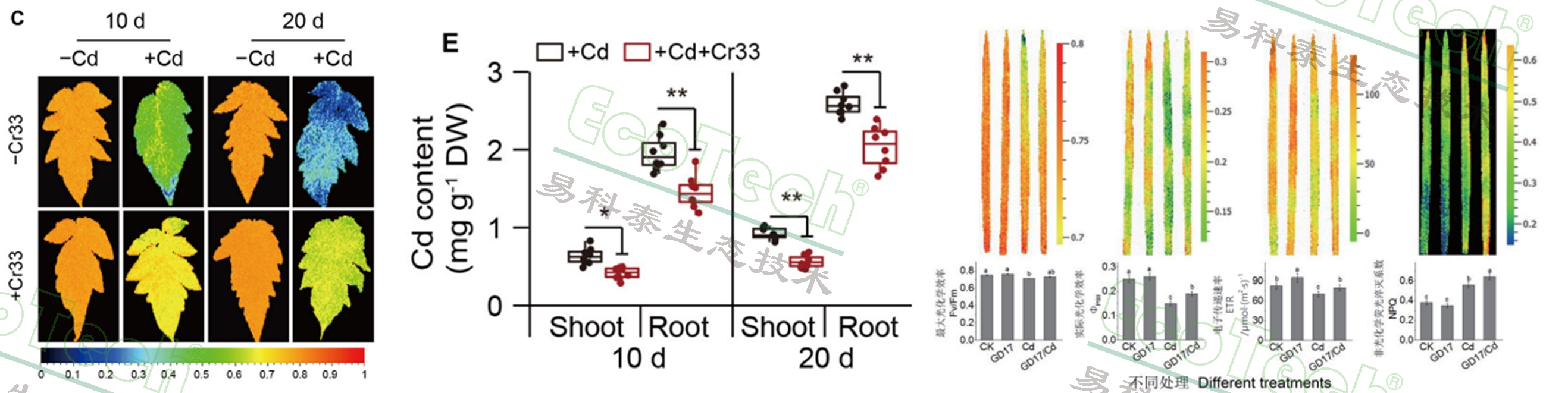 除了直接改良土壤外,利用根際內(nèi)生菌直接調(diào)節(jié)植物對(duì)重金屬的吸收和積累也是重要的研究方向之一。安徽科技大學(xué)與南京農(nóng)業(yè)大學(xué)合作研究發(fā)現(xiàn),根際內(nèi)生菌Lysinibacillus fusiformis Cr33顯著降低了番茄植株鎘(Cd)積累。FluorCam葉綠素?zé)晒獬上窠Y(jié)果表明隨Cd濃度降低,番茄葉片光合系統(tǒng)的損傷程度也顯著降低,證明了根內(nèi)生菌對(duì)地上部的保護(hù)作用。沈陽(yáng)師范大學(xué)則利用FluorCam葉綠素?zé)晒獬上褡C明了根內(nèi)生菌Burkholderia sp. GD17 在水稻對(duì)Cd脅迫應(yīng)答中,對(duì)光合系統(tǒng)具有顯著的保護(hù)性影響,減少了Cd損傷造成最大光化學(xué)效率Fv/Fm、實(shí)際光化學(xué)效率ΦPSII、電子傳遞速率ETR的降低。