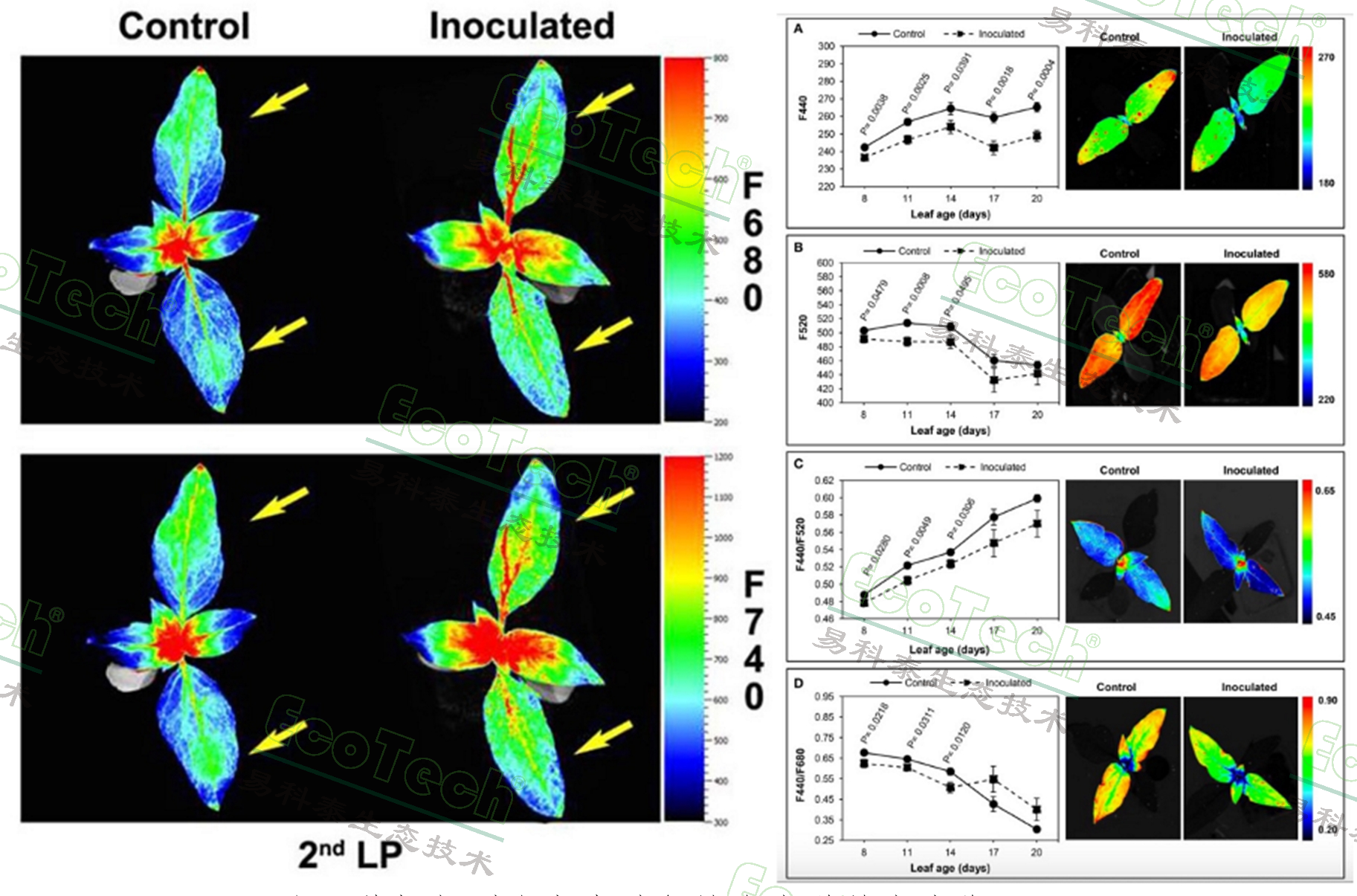 多光譜熒光可同時(shí)對(duì)脅迫誘導(dǎo)次級(jí)代謝產(chǎn)物熒光(藍(lán)綠熒光)成像,并與葉綠素?zé)晒猓t色和遠(yuǎn)紅熒光)成像綜合分析。次生代謝物中的多酚類物質(zhì)是植物抵御病害的重要化學(xué)物質(zhì),黃酮類物質(zhì)則與抗ROS活性氧密切相關(guān),因此利用多光譜熒光能夠靈敏地進(jìn)行極早期病害檢測(cè),甚至土壤病原菌及寄生物造成的根系病害都可以通過(guò)植物地上部的多光譜熒光成像進(jìn)行檢測(cè)。