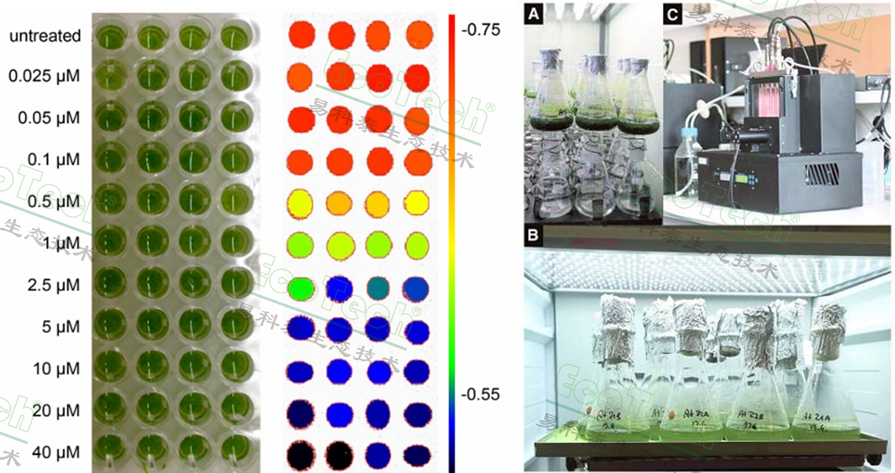 捷克全球變化研究所與丹麥哥本哈根大學(xué)長(zhǎng)期合作研究開(kāi)發(fā)一種高通量生物標(biāo)記篩選方法,能夠快速評(píng)估土壤與環(huán)境中毒性物質(zhì)如除草劑、重金屬等對(duì)環(huán)境生態(tài)的影響。他們使用高等植物的光自養(yǎng)細(xì)胞懸液,結(jié)合FluorCam葉綠素?zé)晒獬上裣到y(tǒng)、FMT150藻類培養(yǎng)與在線監(jiān)測(cè)系統(tǒng)、AlgaeTron AG230藻類培養(yǎng)箱等儀器開(kāi)展了大量相關(guān)研究。實(shí)驗(yàn)結(jié)果表明光自養(yǎng)細(xì)胞懸液結(jié)合FluorCam葉綠素?zé)晒獬上窦夹g(shù)就是一種非常好的環(huán)境毒性生物標(biāo)記。