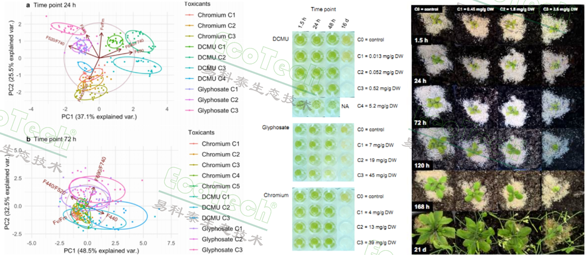 左圖:葉綠素?zé)晒獬上窈投喙庾V熒光成像數(shù)據(jù)的主成分分析;中圖:敵草隆、草甘膦和鉻處理后的擬南芥細(xì)胞懸液;右圖:敵草隆處理后的擬南芥植株