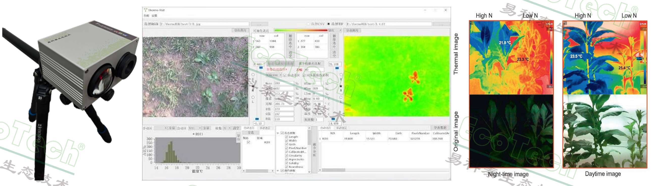Thermo-RGB 成像采用易科泰自主研發(fā)的紅外熱成像與 RGB 成像融合分析技術(shù),有效融合了紅外熱成像的熱輻射信息/溫度信息和 RGB 成像的顏色信息和高分辨率優(yōu)勢(shì),可以方便地進(jìn)行圖像分割處理、提取清晰的圖像信息,并進(jìn)一步精準(zhǔn)運(yùn)行 ROI 選區(qū)分析,能夠同時(shí)檢測(cè)形態(tài)、顏色及溫度分布等,可用于植物表型分析、生物(病蟲害)或非生物(如干旱、鹽堿等)脅迫或敏感性檢測(cè);也可直接用于土壤表面溫度的實(shí)時(shí)成像監(jiān)測(cè)。