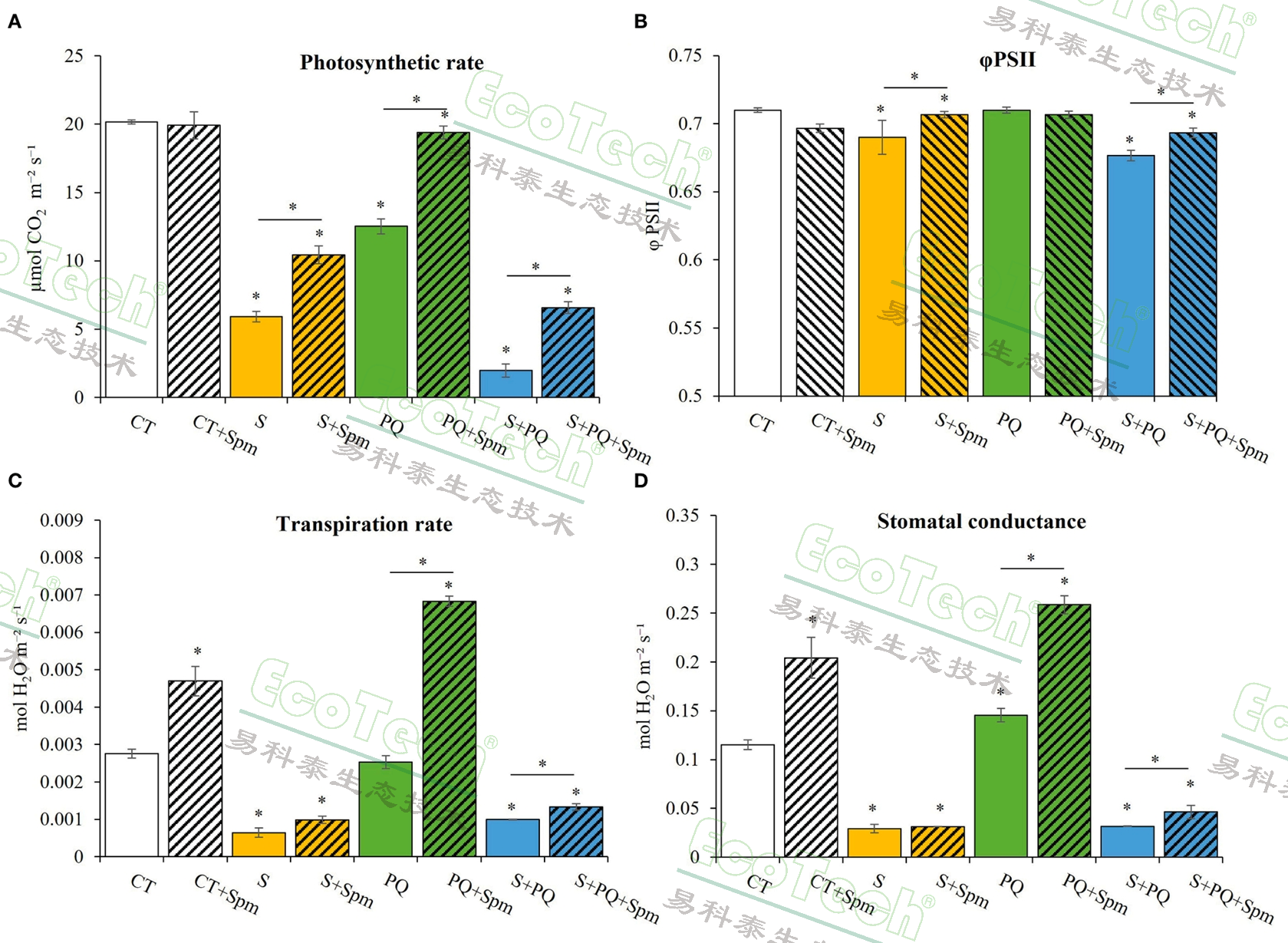 精胺(Spm)是一種多胺類化合物,已被廣泛證明能夠調(diào)節(jié)植物的生理功能,包括抗氧化防御、光合作用效率、細(xì)胞修復(fù)以及基因表達(dá)等。本文研究了外源精胺(Spm)對(duì)番茄植株在鹽脅迫(S)和除草劑百草枯(PQ)復(fù)合脅迫下的緩解作用。該研究發(fā)現(xiàn)外源精胺處理能夠顯著提高番茄植株的存活率、生長狀況、光系統(tǒng)II功能和光合速率,并減少氧化損傷標(biāo)志物(如H?O?和丙二醛)的積累。進(jìn)一步研究發(fā)現(xiàn),精胺通過降低氧化應(yīng)激,改善了番茄在復(fù)合脅迫下的耐受性。該研究為應(yīng)對(duì)氣候變化和土壤污染等多重脅迫提供了潛在的解決方案。
