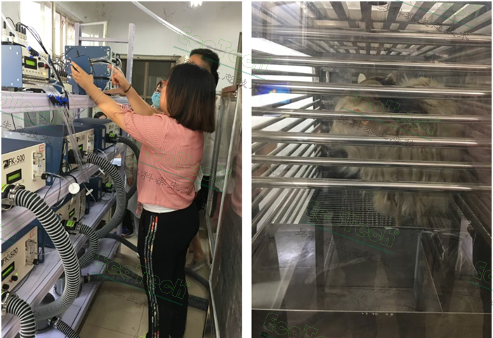 從左至右:易科泰工程師安裝調(diào)試6通道家畜能量代謝測量裝置與定制綿羊呼吸室