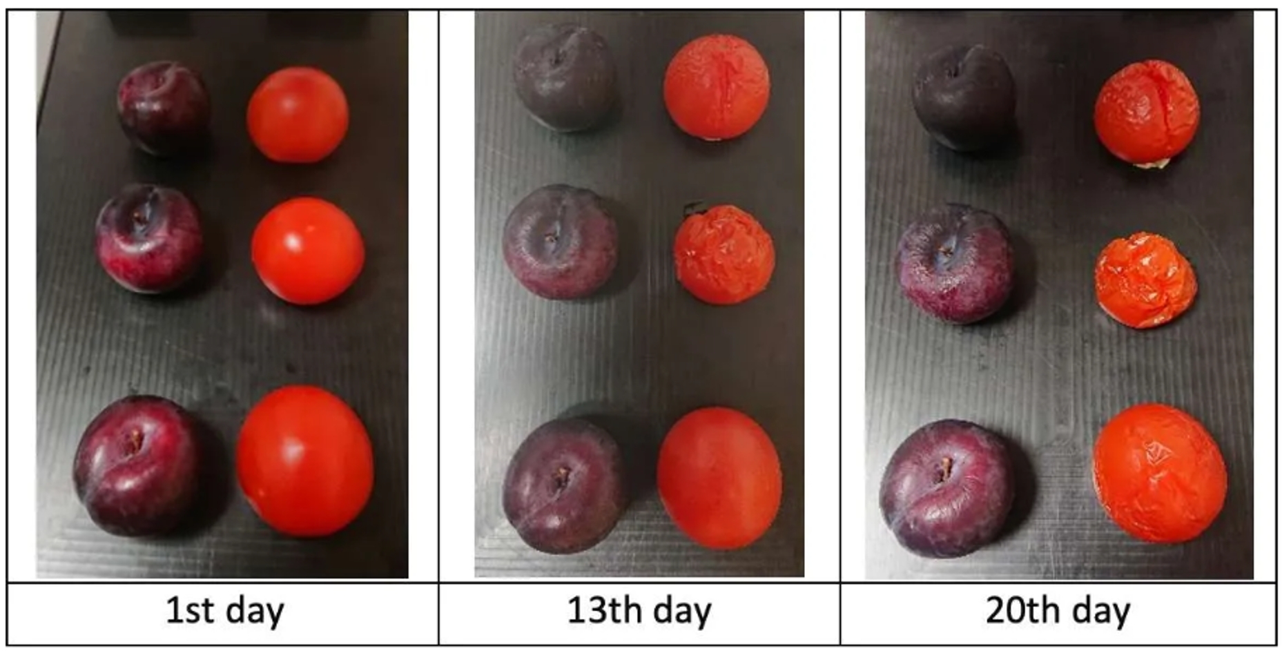 圖1:將三個李子和番茄樣本放置在實驗室掃描儀上,并使用Specim FX10相機測量了20天
