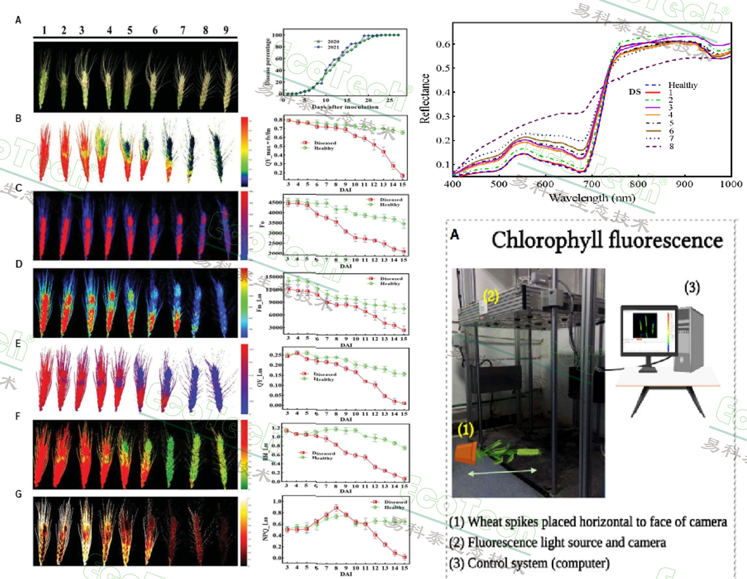 左圖:麥穗葉綠素?zé)晒獬上窠Y(jié)果和不同熒光參數(shù);右圖上:高光譜反射光譜曲線;右圖下,實驗中使用的FluorCam葉綠素?zé)晒獬上裣到y(tǒng)(成像面積35cm*35cm)